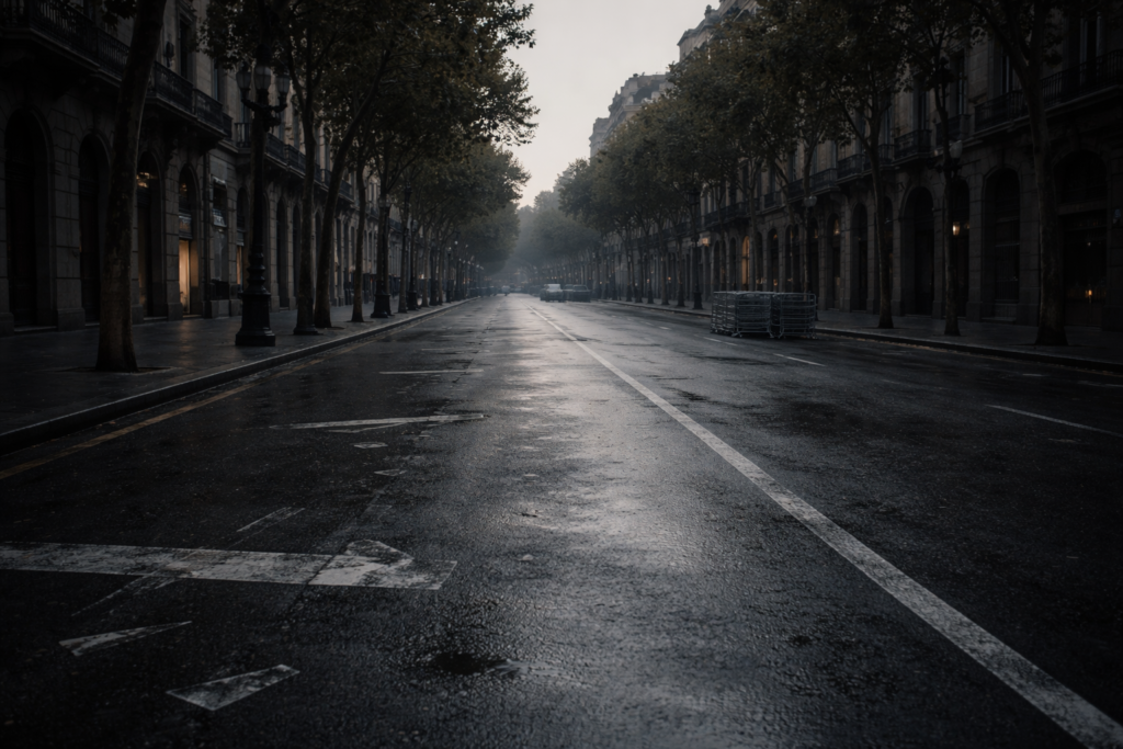 Delivery vans move quietly through intersections they will soon be forbidden to cross. Street sweepers pass once, then again. The asphalt is clean, but not polished. There is no music, no countdown, no urgency.